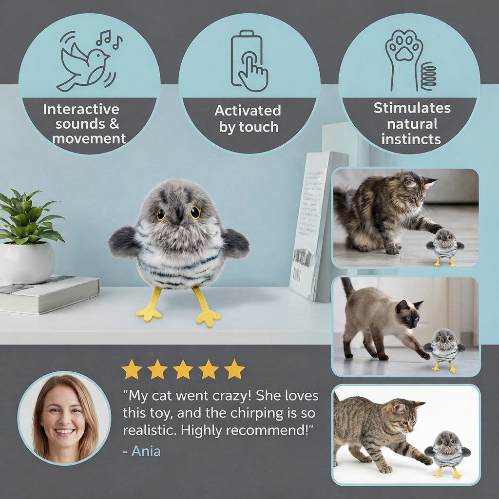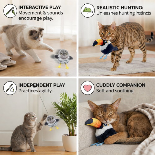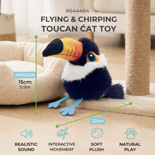 Flying movements imitate real prey and encourage enthusiastic play. - 🔊 Chirping sound increases attention and reactions